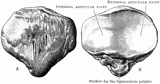 A few quick tips: The patella is rougher anteriorly (frankly, I find the vertical striations so characteristic of the front of the patella to be one of the most distinguishing characteristics of the bone) and smooth posteriorly, where it articulates with the medial and lateral condyles of the distal femur. Superiorly it presents a relatively horizontal edge with rounded corners, while the apex, or inferior portion of the bone is noticeably pointed, leading to the bone’s distinctive triangular shape. On its posterior aspect, the lateral articular facet is larger than the medial articular facet.