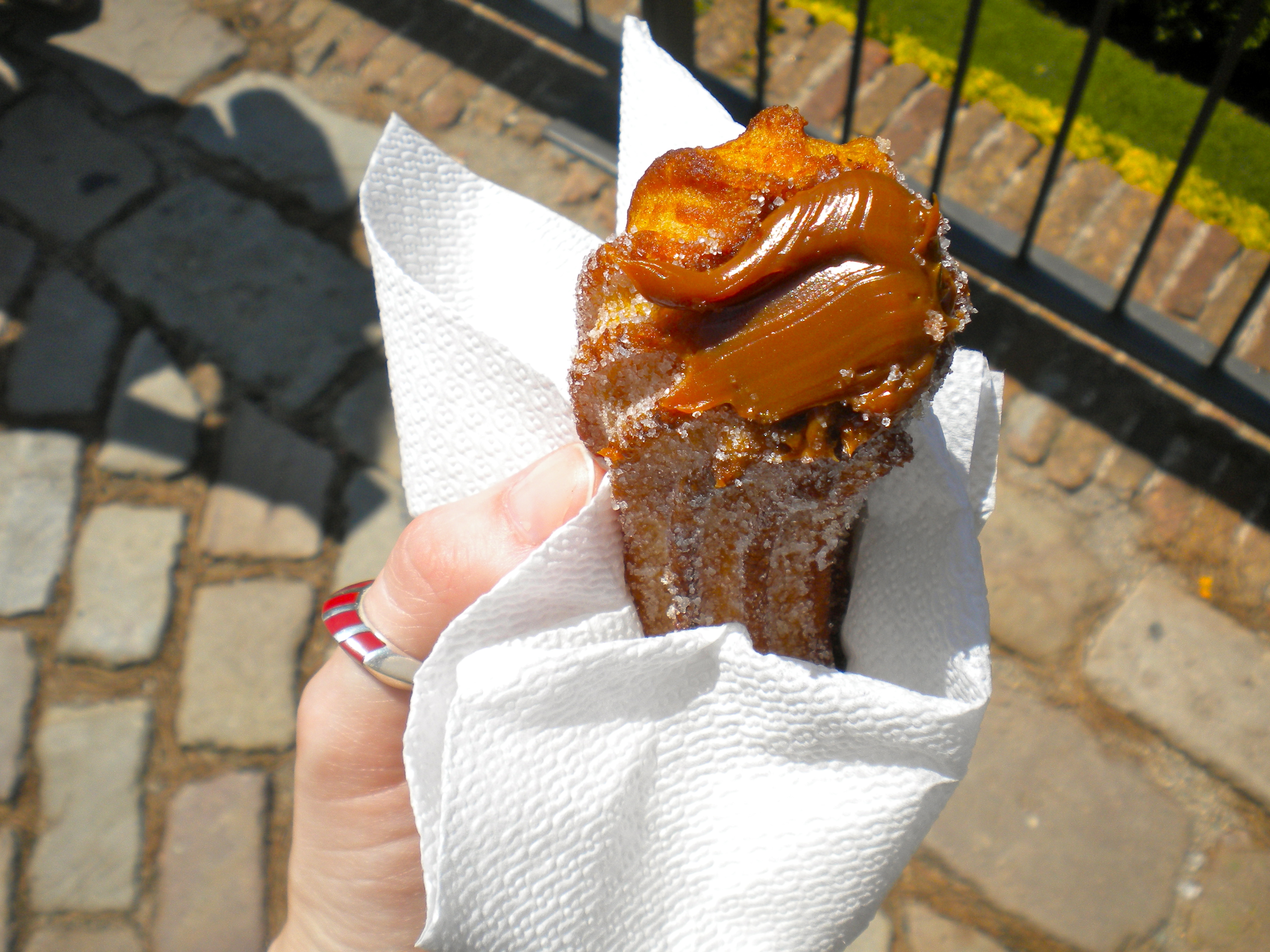 Since I am nothing if not an incorrigible glutton, I was likewise captivated by the city’s food markets. Even La Boqueria, an overwhelming, overpriced assault of color and sound, was well worth the visit. In true frugal graduate student fashion I bought nothing of substance except an apple, spending an hour wandering the stalls and gaping at all the purveyors had on offer, from meticulously molded marzipan candy to whole hocks of jamón Iberico. I made up for lost opportunities later that afternoon at Mercado Santa Caterina, only a twenty minute amble from the far more crowded and bustling Boqueria, sampling llaminets and amassing a collection of morcilla, fuet and manchego baixa en sal for a balcony dinner later that night. However, even the cornucopia of Barcelona’s neighborhood mercados could not prepare me for what I stumbled upon at the summit of Parc de Montjuïc. The entire amble from the Para-lel furnicular to the top of the hill was punctuated by whiffs of a scent that smelled tantalizingly like pancakes. When I arrived at the stock medieval market outside the castle gates, I finally identified its source: a stand devoted entirely to churros, sprinkled with cinnamon, rolled in sugar, dipped in chocolate and, most decadently, stuffed with caramel.