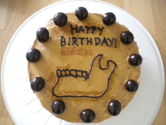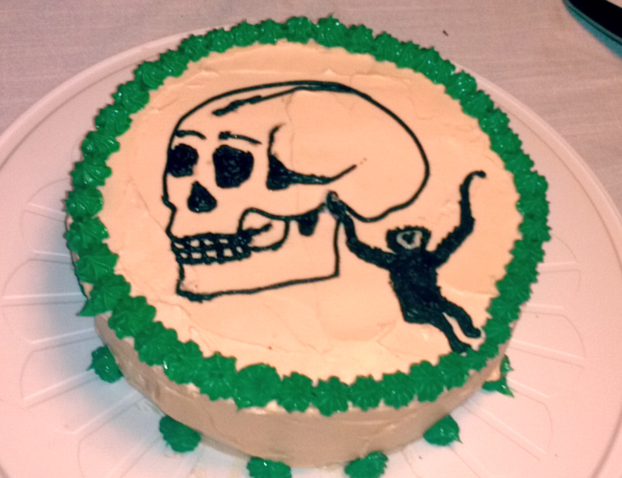 I have forgotten what kind of cake this was – possibly chocolate and peanut butter, judging by the hue of the frosting. I do remember that I baked it, and it was decorated by the lovely and talented Dana Begun – sadly I cannot take responsibility for the genius idea to have a gibbon brachiating from a condylar process. Biological anthropology for the win.
