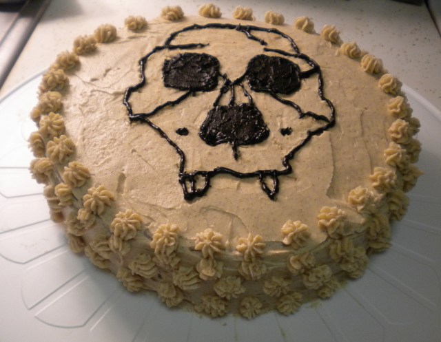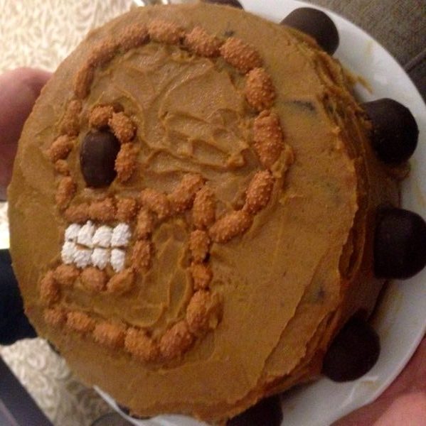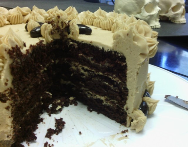 This is a stout beer and chocolate cake with coffee frosting (and dark chocolate malt balls) that I made for my graduate colleague Zachary Cofran – his dissertation was on mandibular growth and development in the robust australopithecines. Hence the jaw. As an osteologist, I am duly apalled by the relative proportions of the condylar and coronoid processes. I hang my head in shame. At least the cake was delicious.