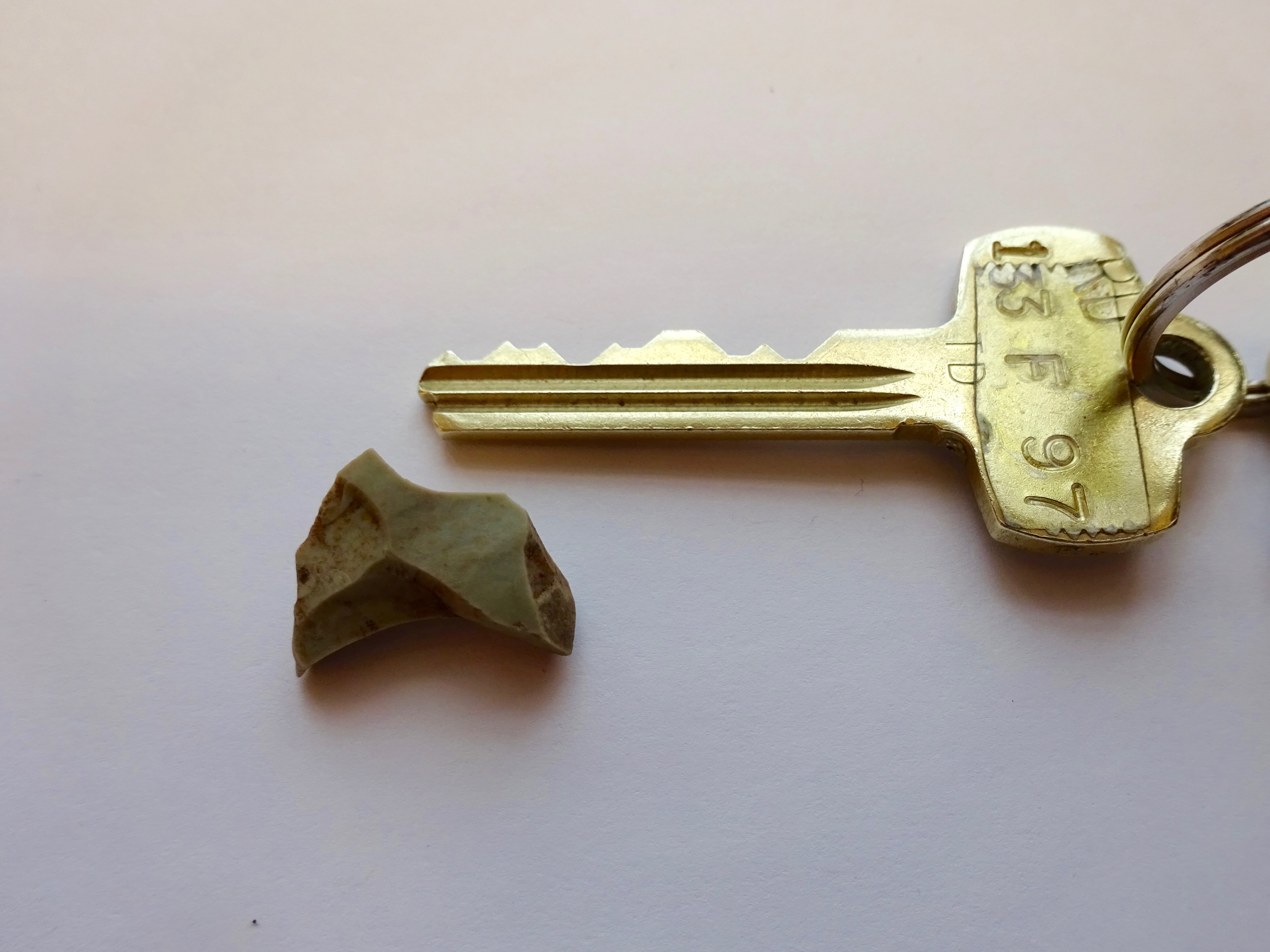 This little lithic is actually a fragment of angled shatter from the rock shelter of Melikane in the moutains of Lesotho, a site dated to around 80,000 years before present. The shatter is from an industry called the Howiesons Poort that dates to around 60,000 years before present – you know, only 12 times older than the bones that I’m studying for my dissertation.