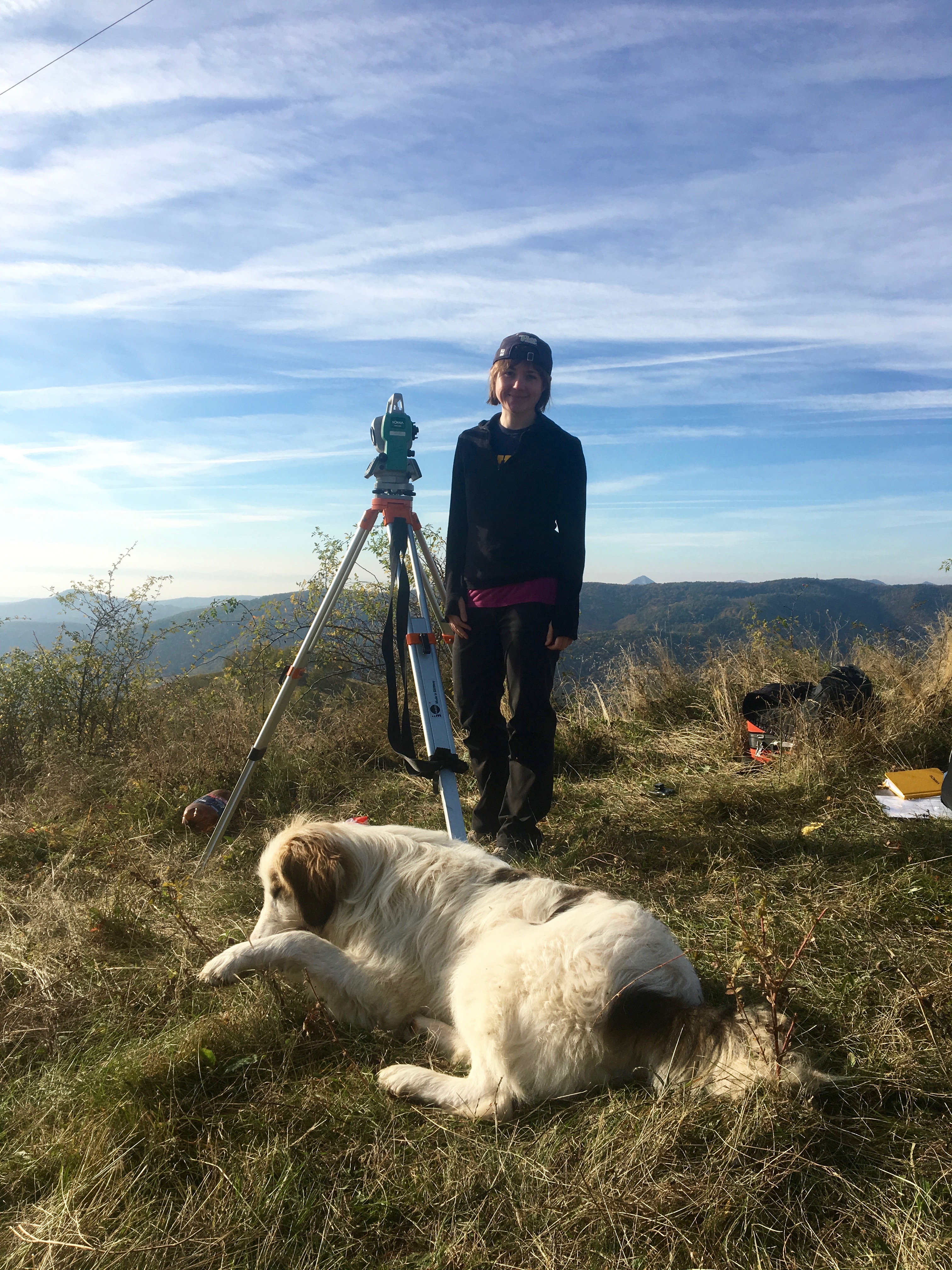 He lingered, just inches away from the total station legs, wagging his tail...