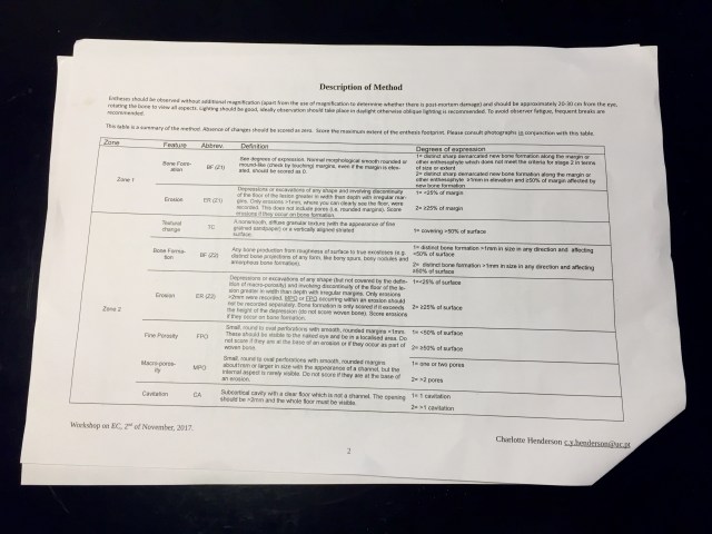 Of course, the first week of November was also when I had elected to embark on my inaugural visit to “the north” and attend a workshop at the University of Sheffield. The workshop was focused on scoring entheseal changes. Entheses (singular: enthesis) are attachment sites of musculoskeletal soft tissue (i.e. tendons, ligaments, muscles, joint capsules, and nail beds). Entheseal changes, therefore, are any deviation from normal entheseal anatomy.